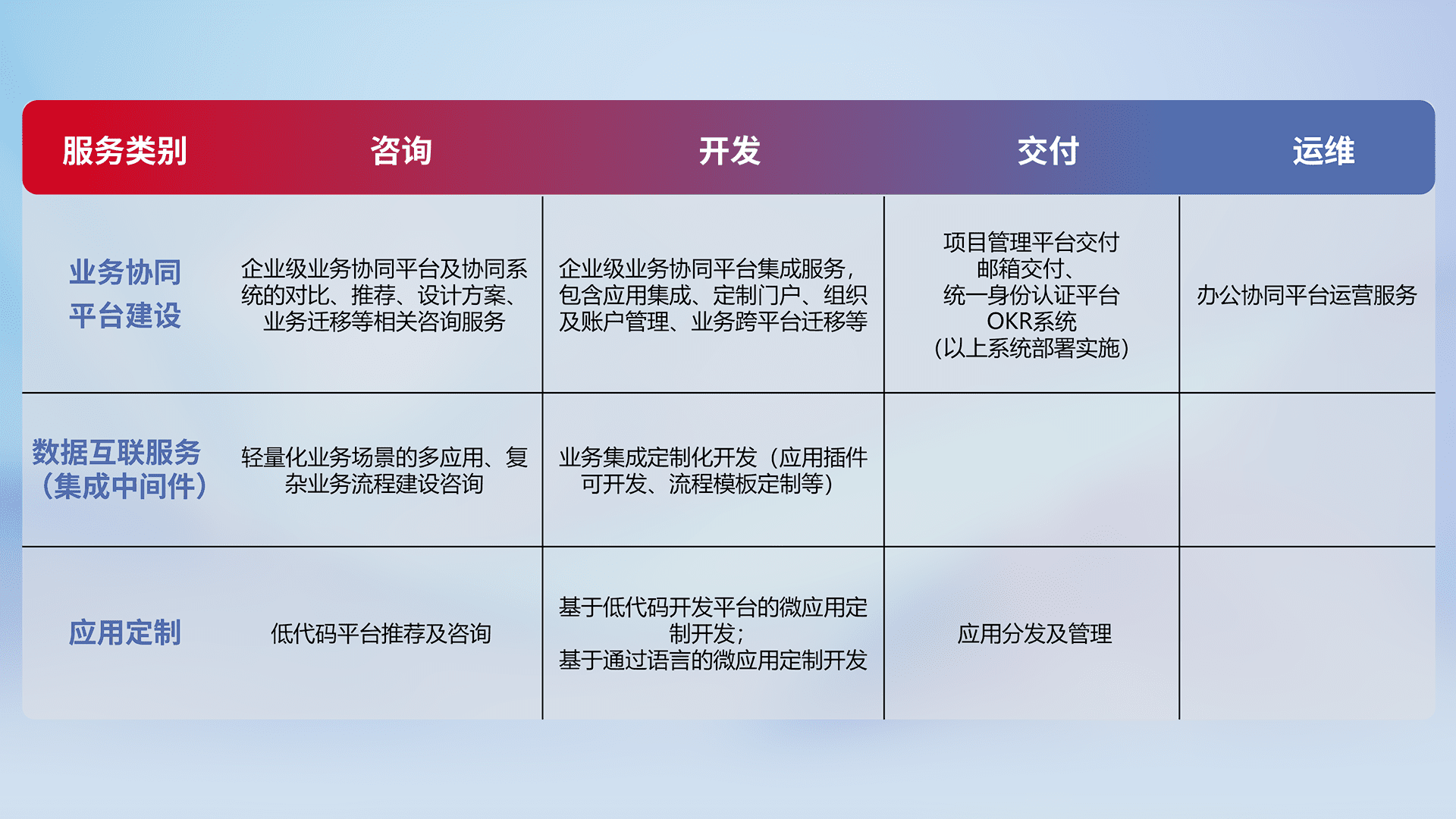 针对钉钉、、、企微、、、IDaas等平台级产品提供产品的规划、、、方案、、交付、、、、定制化开发等服务,,实现如统一协同办公、、、智能客户服务、、、、混合会议管理、、智能数据查询、、等业务场景,,,,实现数字化转型。。。